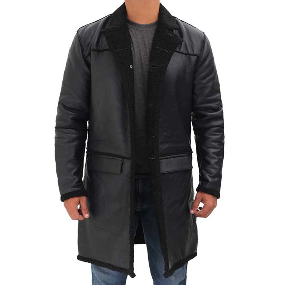 New Mens Mid-Length Black Leather Sherpa Long Coat